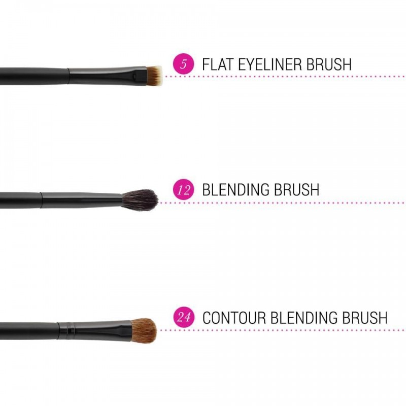 The selection of synthetic blending basics can be used with liquids, creams and powders to achieve endless eye effects with ease, from subtle to spectacular. Use the contour blending brush for shading in the crease and to highlight the brow bone. The soft, fluffy bristles of the blending brush are ideal for crease and brow bone shading and on cheeks. The flat liner brush makes it easy to draw a precise line every time and coax liner deep into lashes for a seamless look.