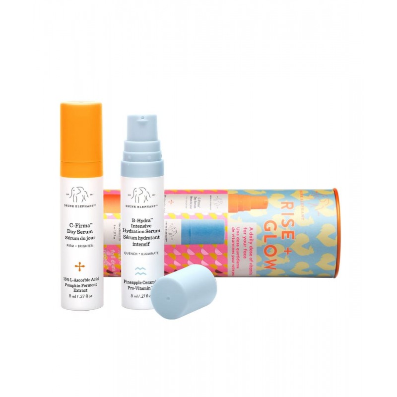 You take your vitamins every morning, so why stop there? This daily dose for your complexion delivers powerful antioxidants to firm and brighten while replenishing essential hydration. Witness your glow every day. The Rise + Glow™ travel-sized duo is your skin's daily dose of vitamins B and C for an all-day quenched and glowing complexion. The formulas, which include the C-Firma™ Day Serum and the B-Hydra™ Intensive Hydration Gel, deliver powerful antioxidants to visibly firm and brighten the skin as they replenish essential hydration.