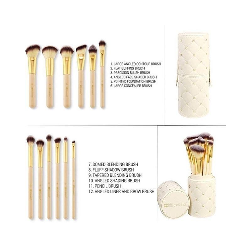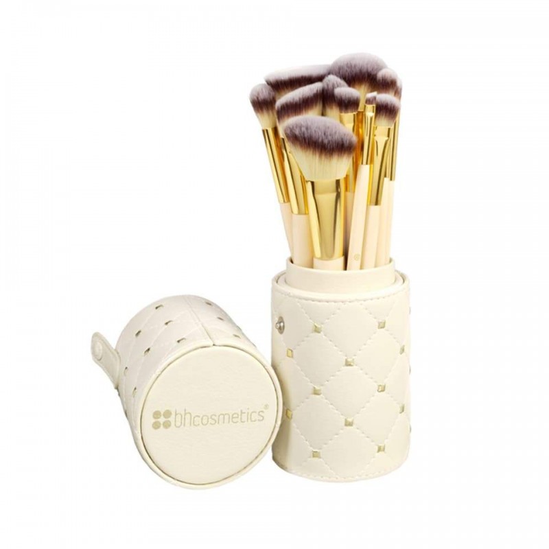 Add a chic designer touch to your makeup table with our Studded Couture 12 Piece Brush Set, a high-style selection of face and eye brushes in a gold-studded ivory cylindrical case. The super-soft, professional-quality synthetic brushes apply makeup with ease, providing precision just where you want it. The protective hard case snaps closed for travel