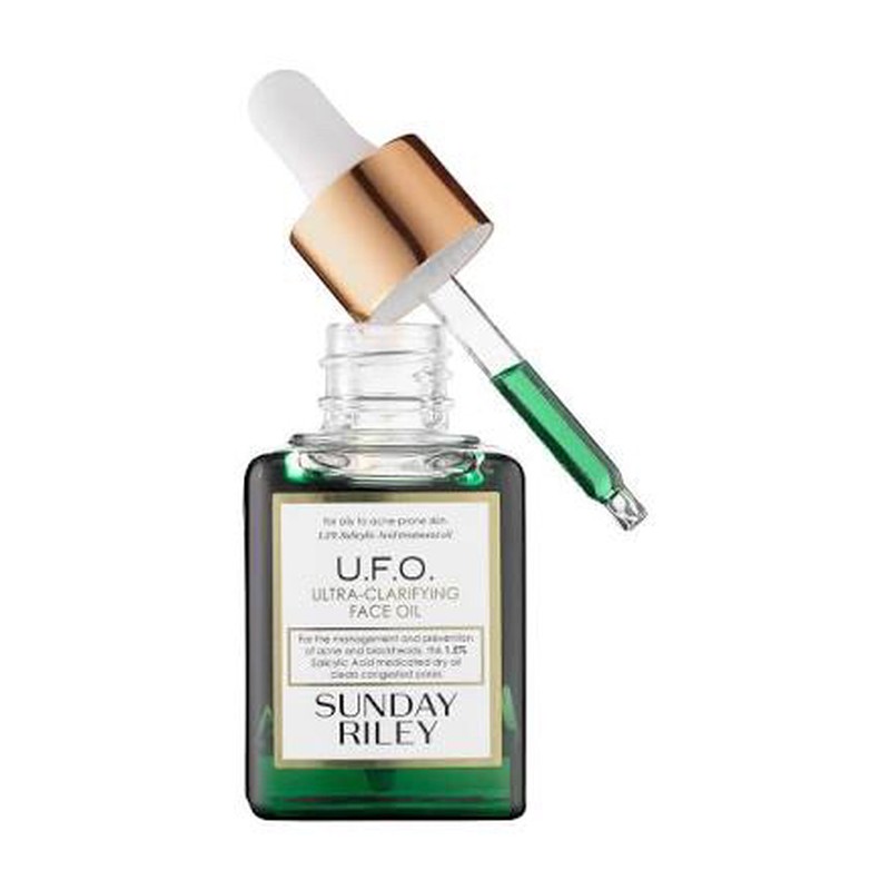 "When I formulated U.F.O., I wanted to create a dry oil that practically disappears into the skin, leaving oily skin smooth (but never greasy) and yet effectively treated for blemishes and blackheads. Salicylic acid is notoriously over-drying, leaving your skin stripped and looking irritated. By infusing salicylic acid into clarifying oils (like tea tree oil and black cumin seed oil), the drying effects of salicylic acid are nipped in the bud, while all of the treatment aspects (like clearing congested pores and managing blackheads and blemishes) are in full-force. U.F.O. is part of the new Green Line, along with Martian Mattiyfing Melting Water-Gel Toner, created specifically for oily skin clients."—Sunday Riley