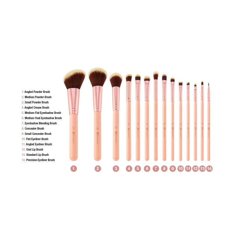 Blush, blend, line and define with our pale pink BH Chic 14 Piece Brush Set, a collection of professional-quality brush essentials for face, eyes, and lips. The two-tone synthetic brushes can be used with liquids, creams and powders to achieve precise makeup application, allowing you to create flawless looks ranging from subtle to striking. Brushes come in a matching zip-up case with room to stash additional items.
