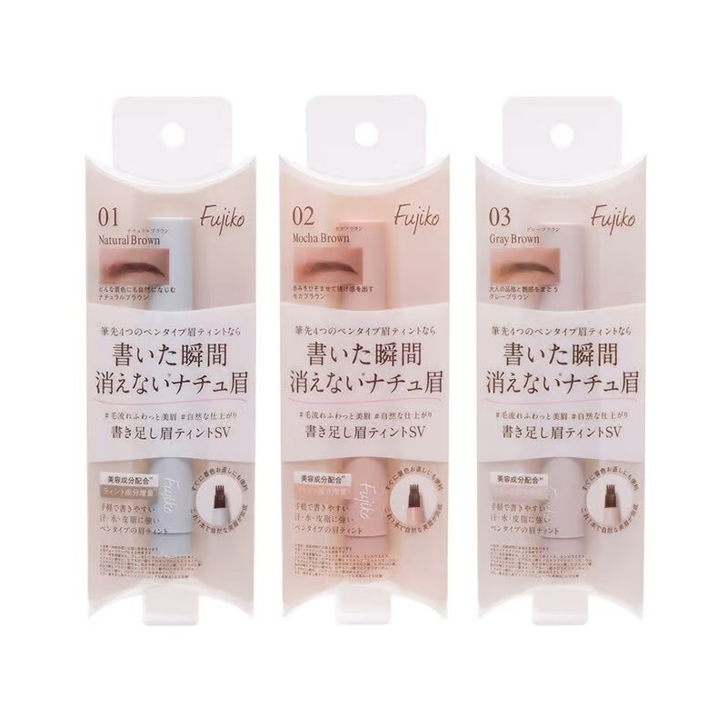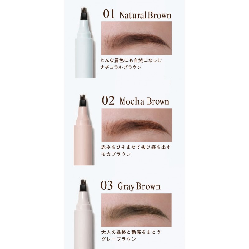 Touch up your eyebrows every day with this tint to create excellent, long-lasting eyebrow makeup. The pigmentation looks natural, making it easy to create a natural eyebrow look. This eyebrow tint pen comes with a new brush tip that is split into 4 ends. It allows you to draw each and every single line with precision while setting the hair flow or raising the hair at the inner corners. Draw bold lines by laying down the brush, or create fine lines such as at the ends by using it in a standing position.
