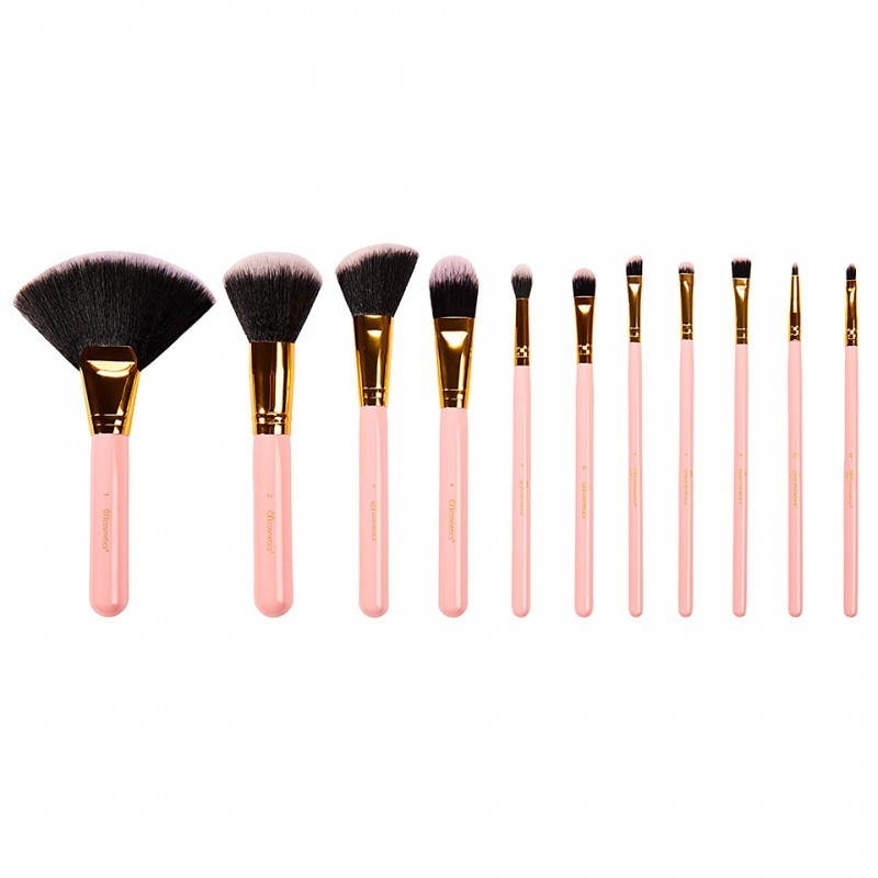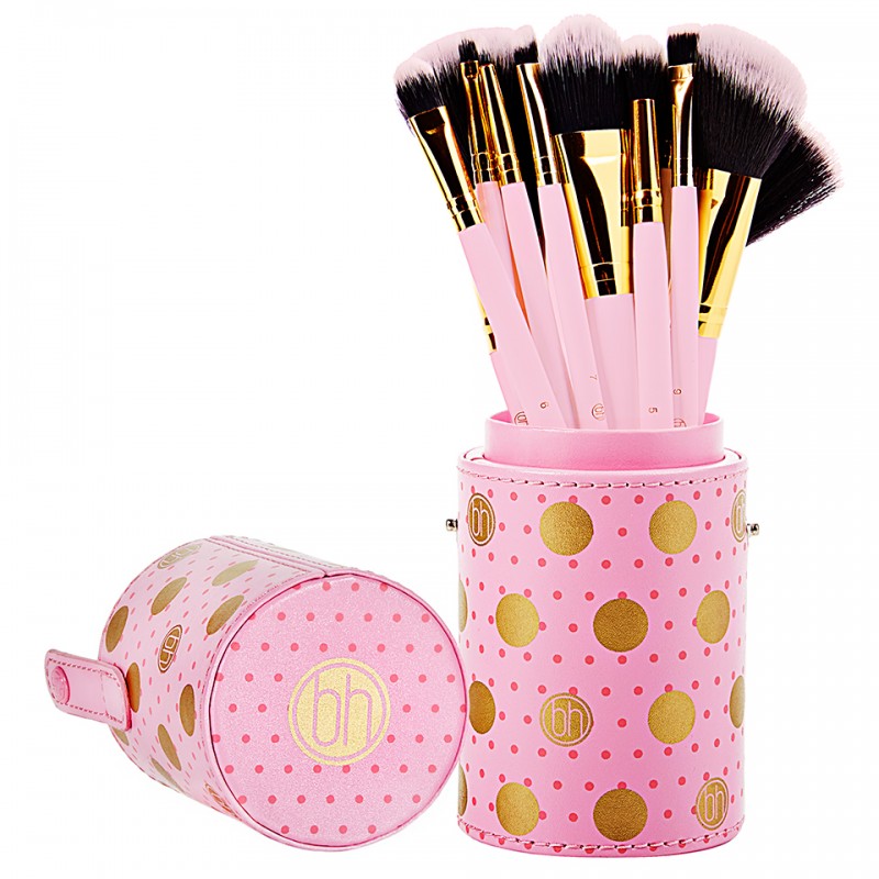 Our adorable Dot Collection - 11 Piece Makeup Brush Sets are spot on! Featuring plush, cruelty-free face and eye cosmetic brushes with matching bristles and handles in a convenient hard, cylindrical storage case, it adds a touch of color and playfulness to your counter top or vanity. Multipurpose brushes include: angled liner, lip, flat eyeliner, angled shadow, small smudge, classic shadow, tapered shadow, classic foundation, angled blush, powder and deluxe fan (great for applying bronzer to the body).