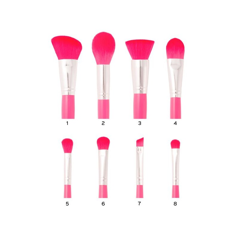 This sophisticated brush set contains eight elegant, pink handled brushes. The soft, synthetic bristles are perfect for creating a wide variety of looks. All brushes come in a stylish, matching pink leatherine case which doubles as a secure traveling companion and a convenient brush holder.