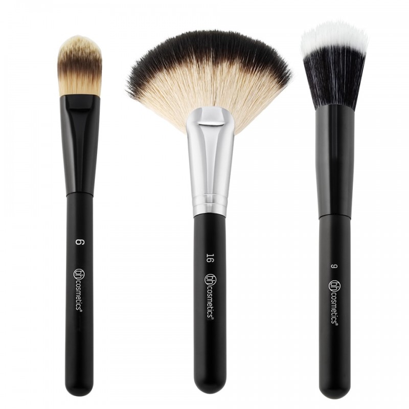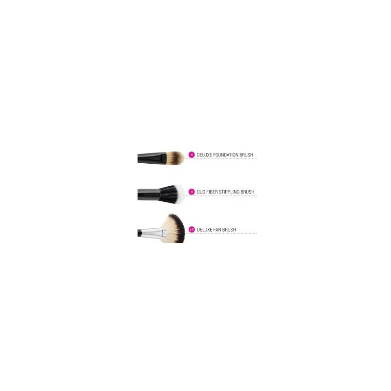 Our multipurpose Blending Face Trio - 3 Piece Brush Set features everything you need for flawless application of all kinds of liquid, cream and powder face makeup in one convenient kit. Smooth on foundation effortlessly with the foundation brush, as well as primer and concealer. The duo fiber stippling brush also applies foundation, plus blush and bronzer, and offers optimum control for contouring. Use the super-soft deluxe fan brush with highlighter, setting powder, bronzer on face and body, and for whisking away shadow and mascara residue beneath the eye.