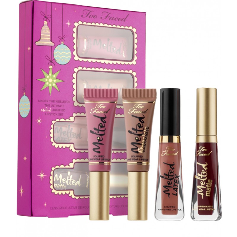 Melt your heart out with a clutch-size collection of Melted Liquified Long Wear Lipsticks in bestselling Melted, Melted Matte, Melted Chocolate, and Melted Latex formulations. Too Faced’s innovative formula comfortably coats lips in bursts of intense, high-impact, saturated color that lasts for hours. The long-wear formula is inspired by the glossy form of liquid lipstick in cosmetic lab vats. Included angled applicators allow for precise application—no brush or liner needed.